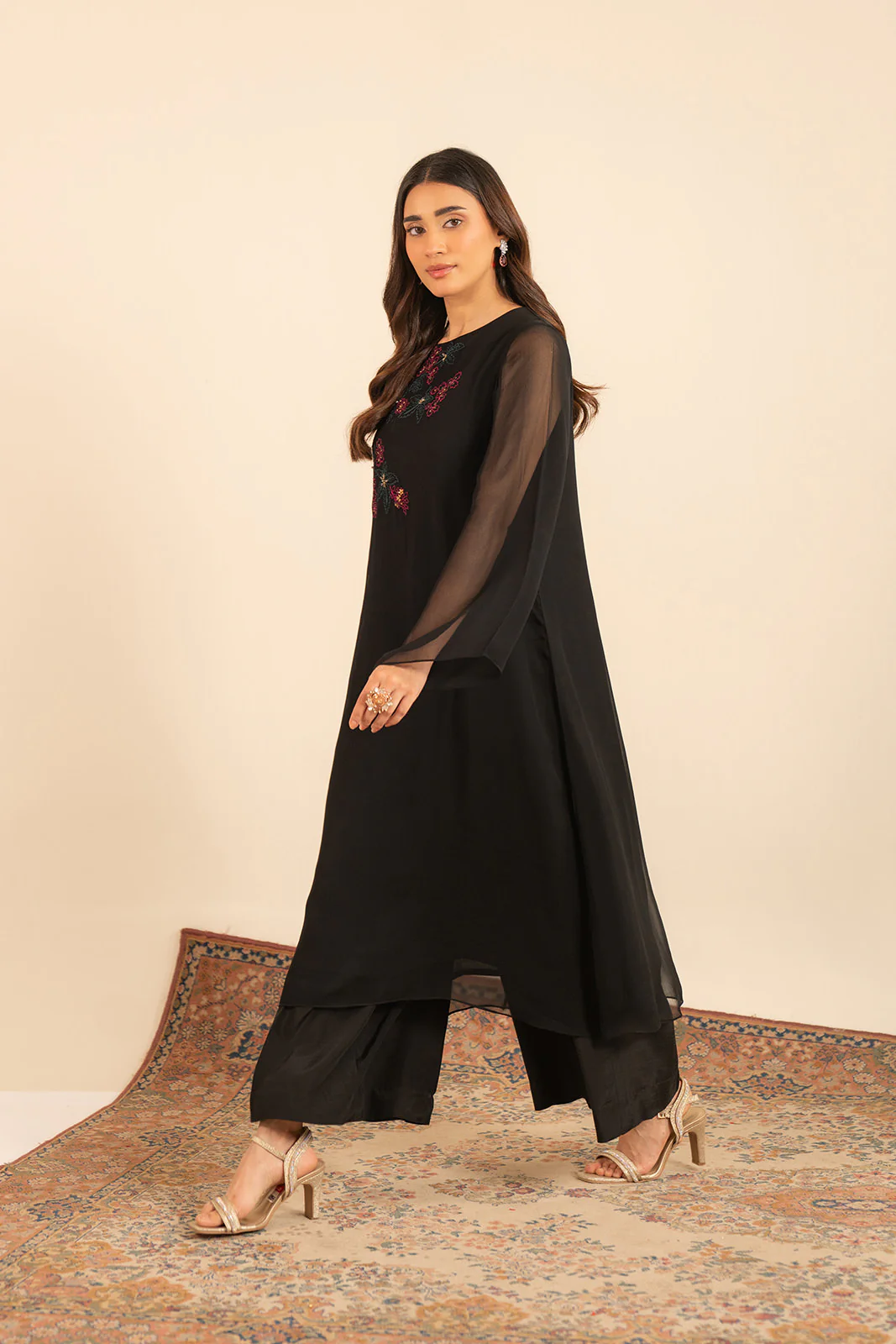 The solid black Wide leg silk trouser is a stylish & sophisticated piece.