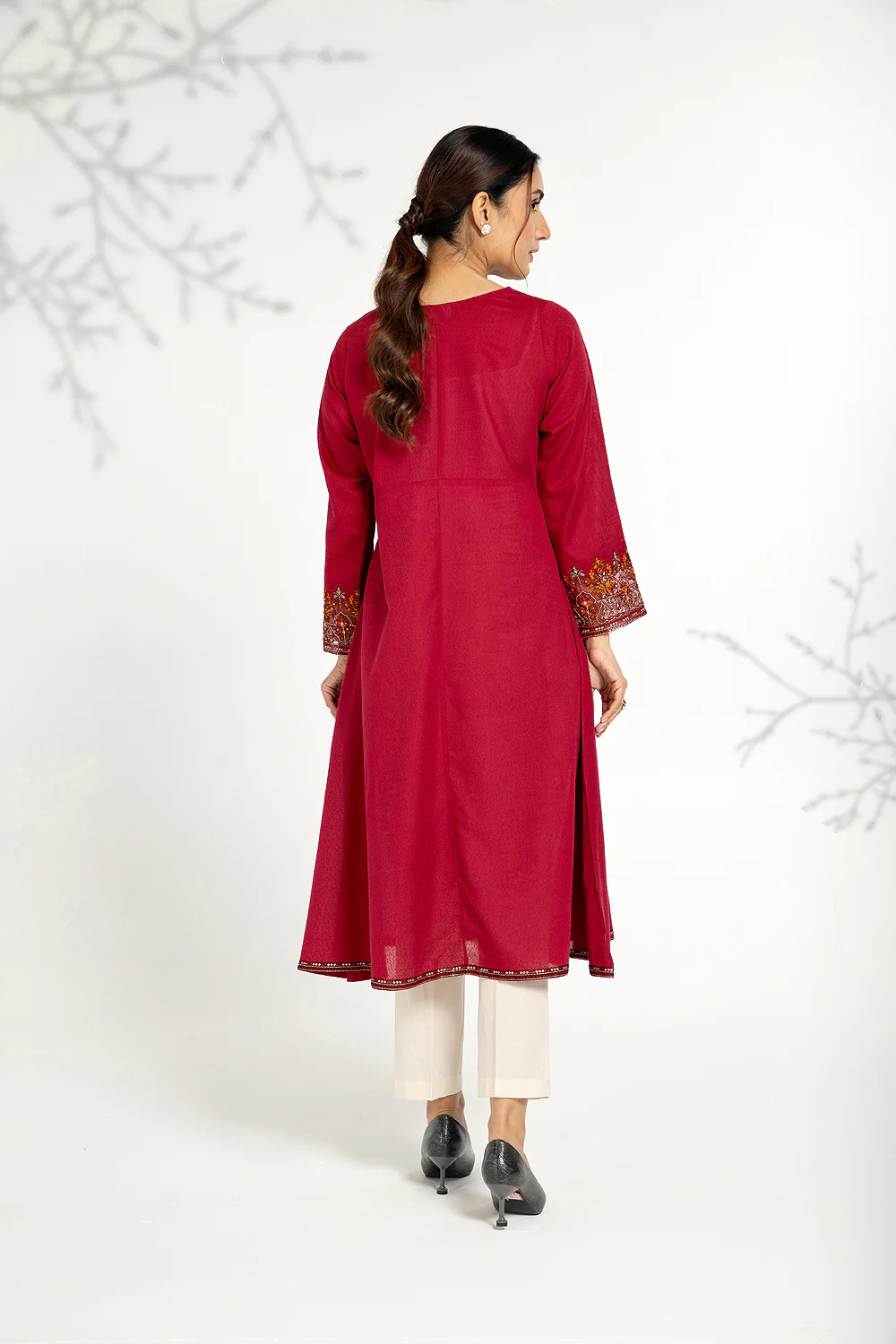 Lawn Karandi Flairy Shirt With Embroidery On Neckline Sleeves And Bead Work And Tasseling On Neckline.