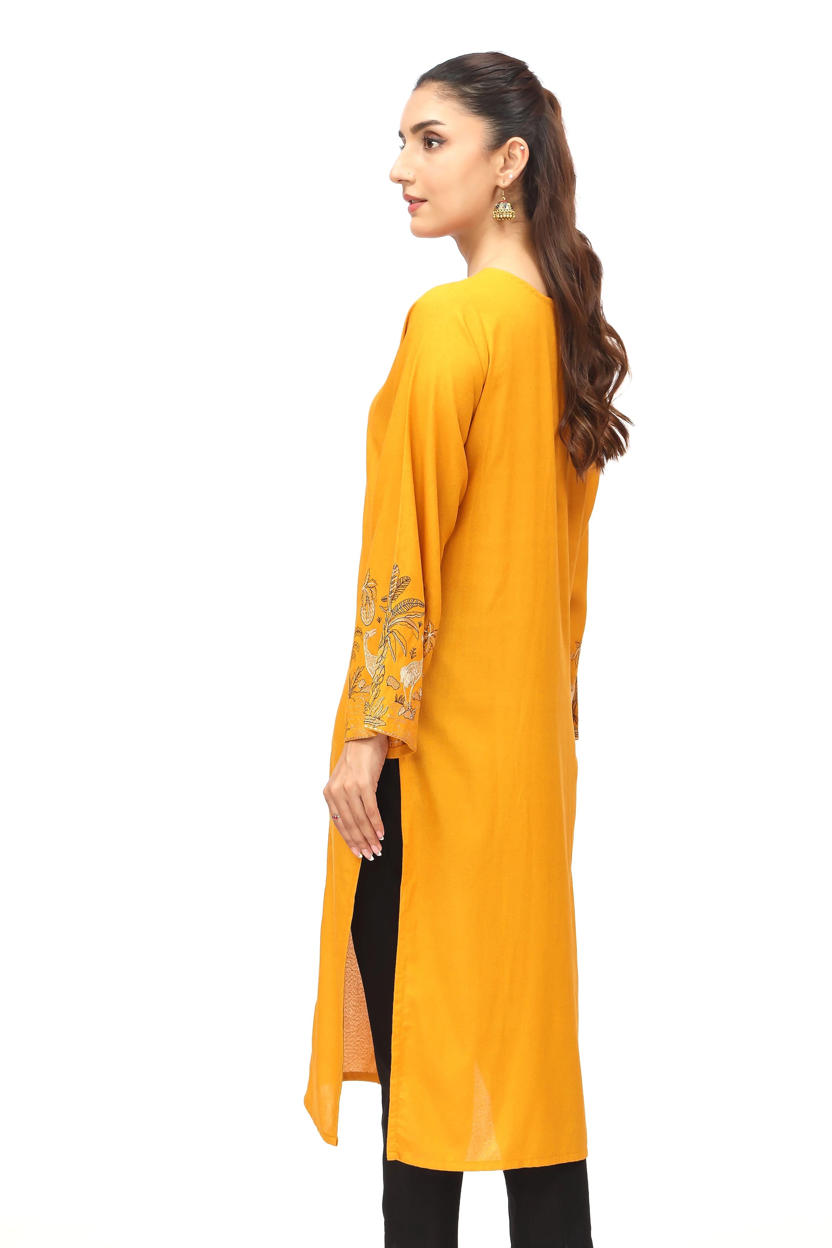 Mustard Lawn Karandi Shirt With Embroidery N Neckline & Sleeves Detailed With Beaded Tassels.