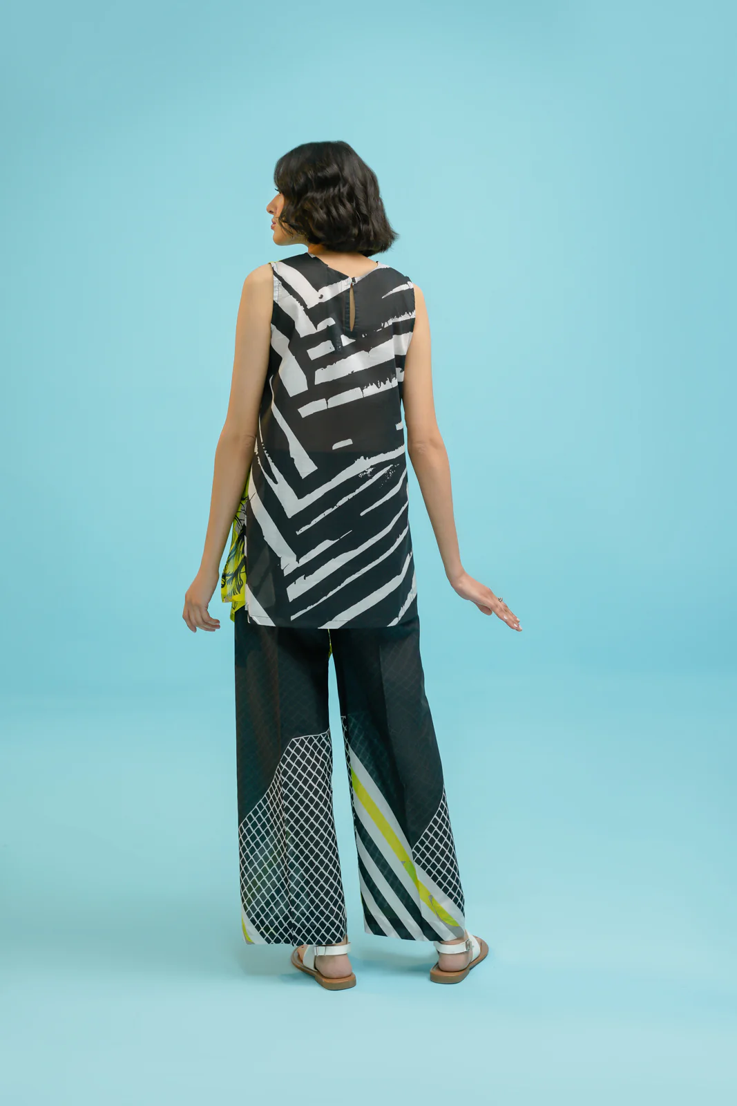 Elevate your style with our lime green two-piece suit featuring a printed short shirt paired with printed pants.