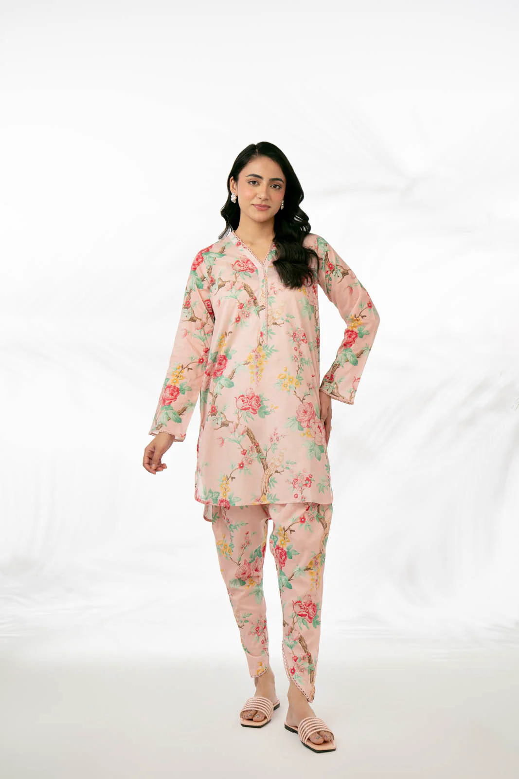 Elevate your style with our powder pink floral printed two pieces suit featuring a short shirt with tulip shalwar.