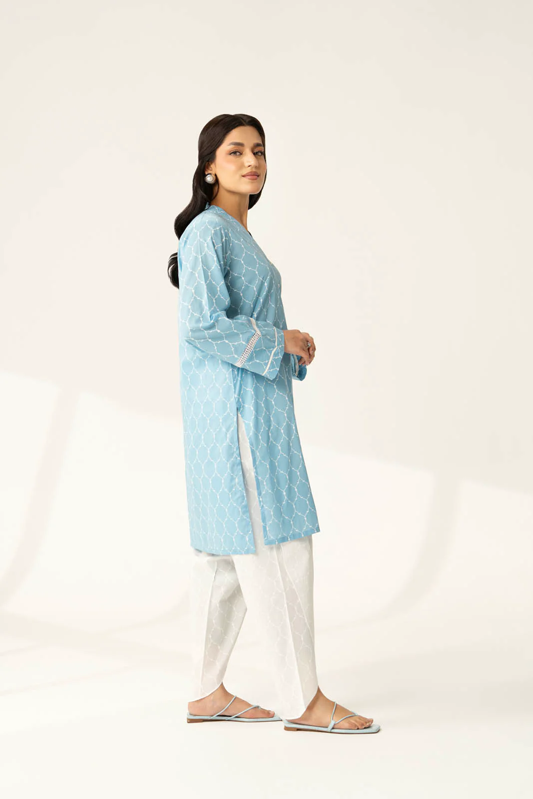 Blue screen-printed lawn shirt with lace detail on sleeves, paired with self-screen-printed cambric tulip shalwar.