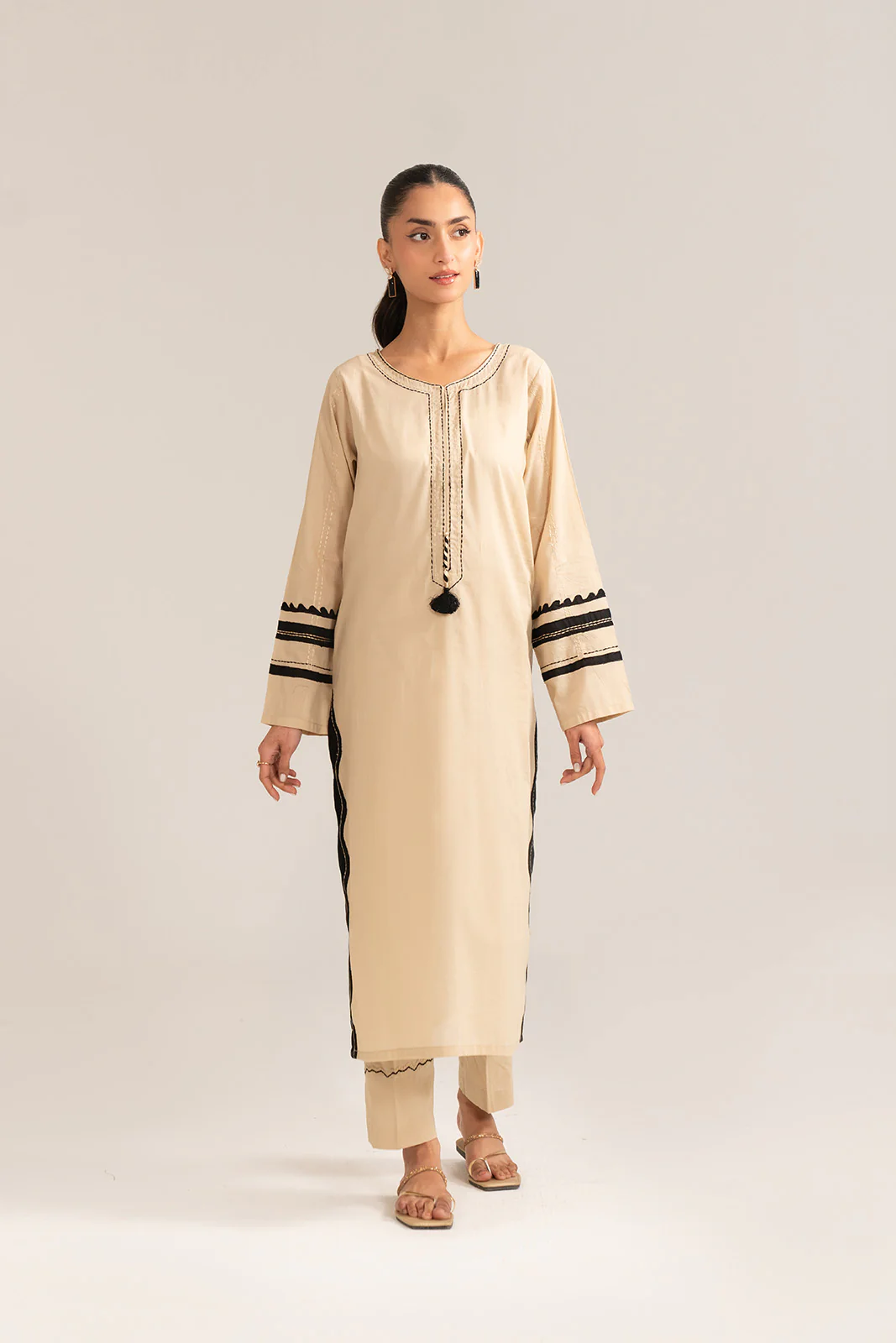 Beige lawn shirt with applique work detail on front & sleeves with added top stitch paired with plain trouser.