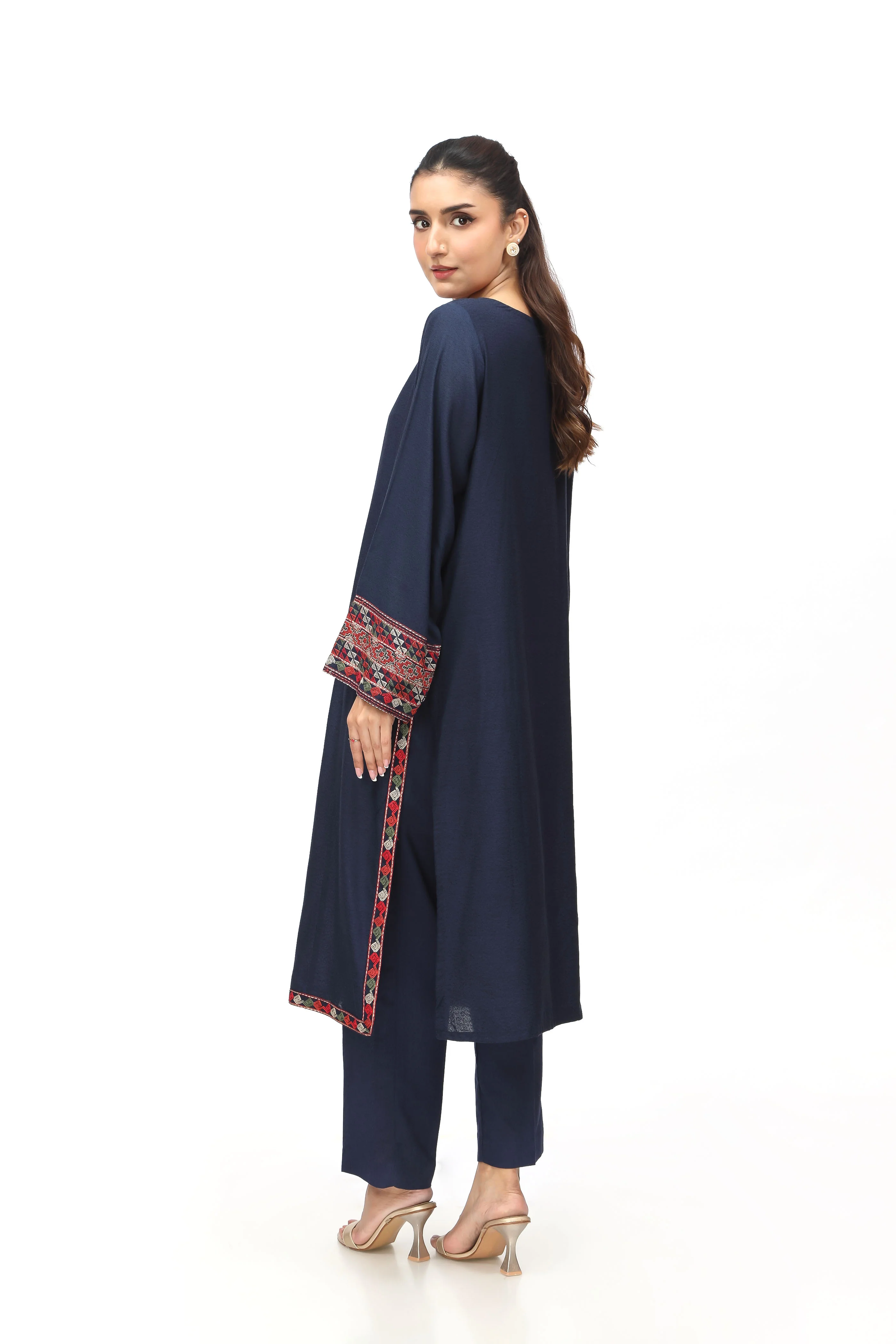 Navy Blue Lawn Karandi Shirt With Multi Color Embroidery On Neckline & Sleeves Paired With Lawn Karandi Trouser.