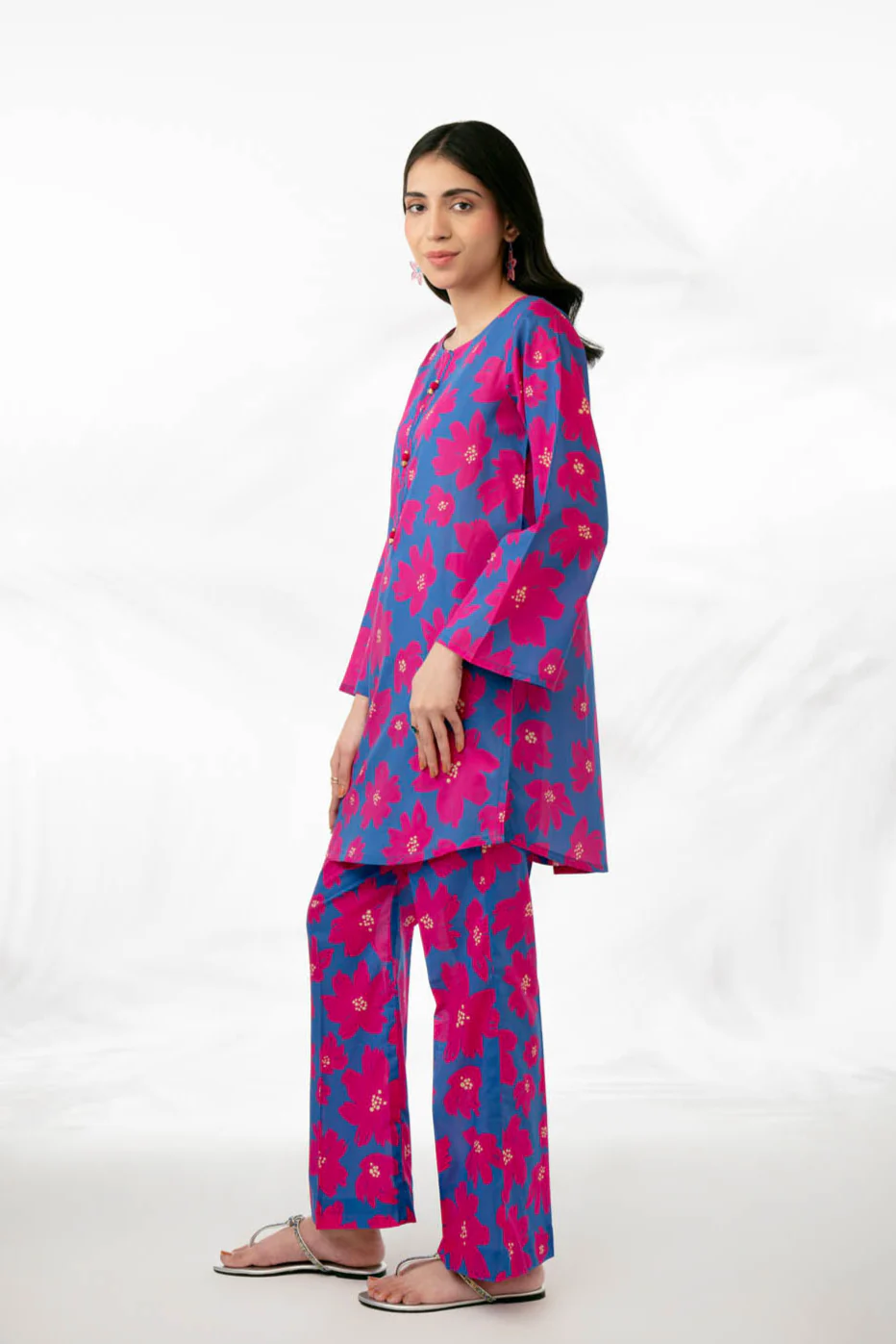 Printed cord set with funky florals , perfect for a summer day paired with boot cut pants with minimal details .
